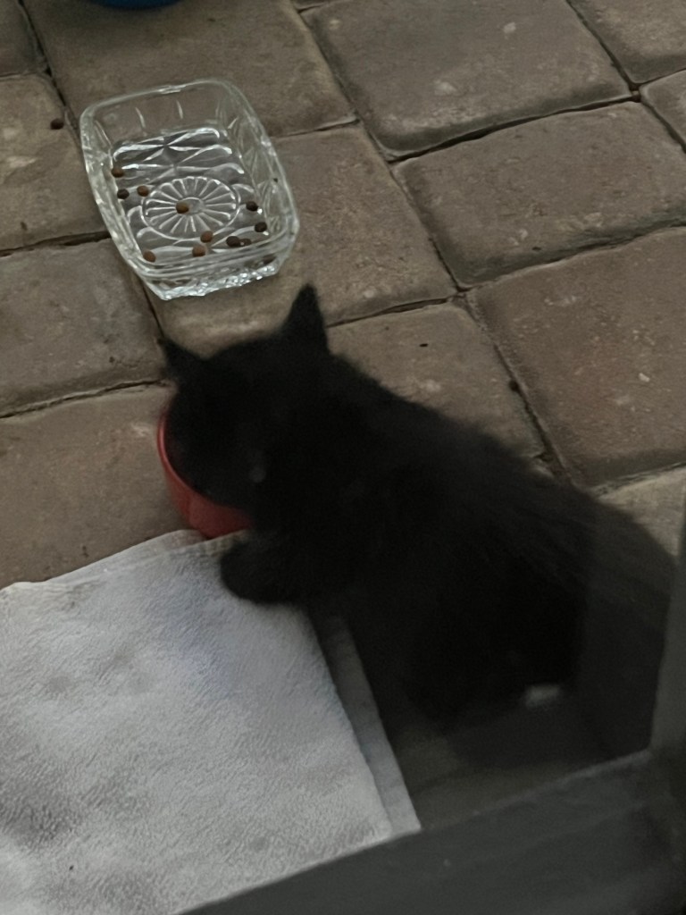 The baby came by and ate by herself tonight. I think that mean cat is the daddy, also pictured. Baby is kind of fluffy and her legs seem short. “She’s” also missing the hair off the last inch or so of her tail. She was eating when daddy came up but he saw her and walked off so I’m not worried he’s going to hurt her. Mama cat came by about half an hour later to eat.